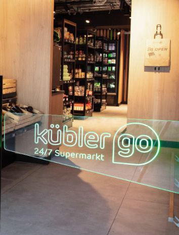 Die Traditionsmetzgerei Kübler will 24 Stunden 356 Tage im Jahr durch ihren neuen 113 m² Shop verfügbar sein. Damit dies in vollständiger Selbstbedienung vonstatten geht, werden sowohl Check In wie auch Check Out benötigt, zudem muss das Kundenverhalten überwacht werden. Neben der Konzeption extravaganter Lichtplanung werden auch neue Kühlregale in die vorhandenen Wandnischen gebaut.